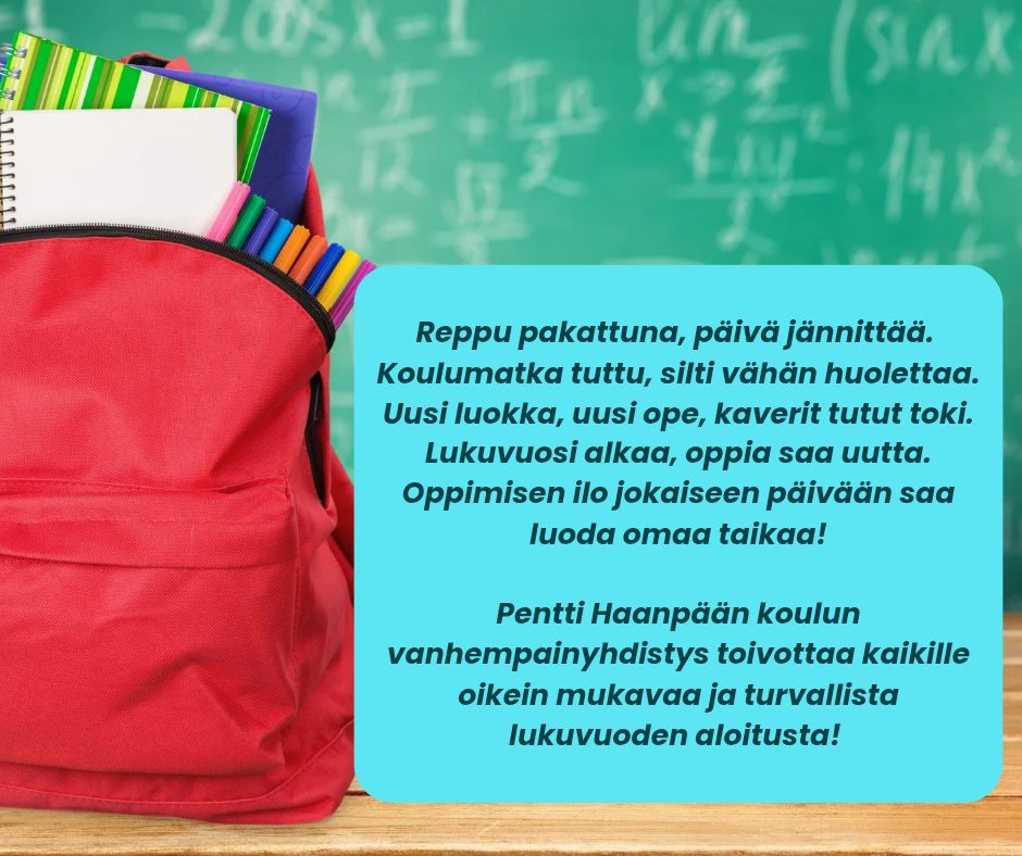 Pentti Haanpään koulun vanhempainyhdistys toivottaa kaikille oppilaille oikein antoisaa opin tietä, ja muistuttelemme teitä huoltajia, että mukaan meidän toimintaan ovat kaikki koulumme oppilaiden huoltajat tervetulleita. Turvataan yhdessä lasten koulu taivalta, luodaan puitteet jossa jokainen tulee kuulluksi ja kehitetään yhteistyötä kodin ja koulun välillä rakentavasti. Uusia ideoita otamme aina vastaan, kahvittelu ja keskusteluhetkiä järjestämme sekä pyrimme luomaan sekä tuottamaan Pentti Haanpään koulun oppilaille hyvän oppimis- ja kasvuympäristön. Yhdessä tehden!